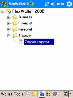 Насущная задача всякой Productivity – удачно заховаться. Иными словами, куда-то спрятать все секретные заметки, ПИН-коды, пароли, номера счетов, телефоны любовников (-вниц) и прочую лабуду. Общее название программ такого рода – Wallets (портмоне). Для Pocket PC таких портмоне как собак нерезаных, причем один хуже другого. Как сговорились. А потом вдруг – бах! – и набрел на настоящую жемчужину: Two Peaks FlexWallet 2005: