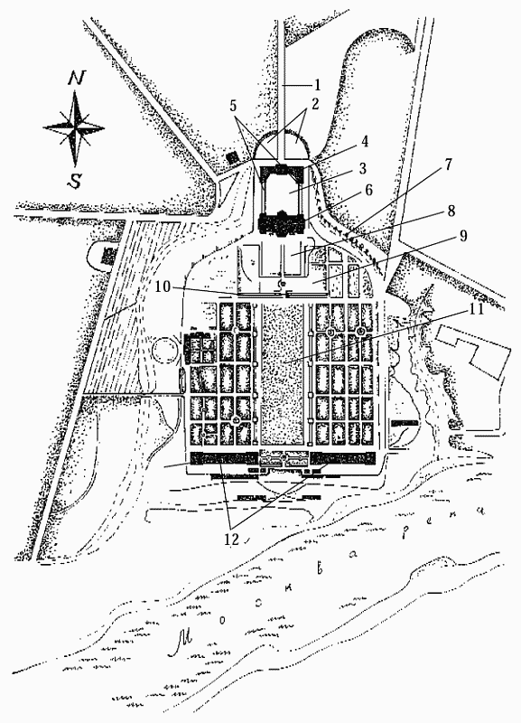 Усадьба Архангельское в начале XIX века: Императорская аллея (1), трельяжные аллеи (2), парадный двор (3), служебные флигели (4), двойные колоннады (5), Большой дом (6), старые голицынские лиственницы (7), верхняя терраса (8), нижняя терраса (9), подпорная стена нижней террасы (10), Большой партер (11), оранжереи (12), фонтан (13)