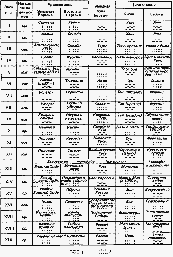 Сводная таблица изменений степени увлажненности Евразийского континента (на материале палеоэтнографии): 1 – увлажнение; 2 – усыхание.