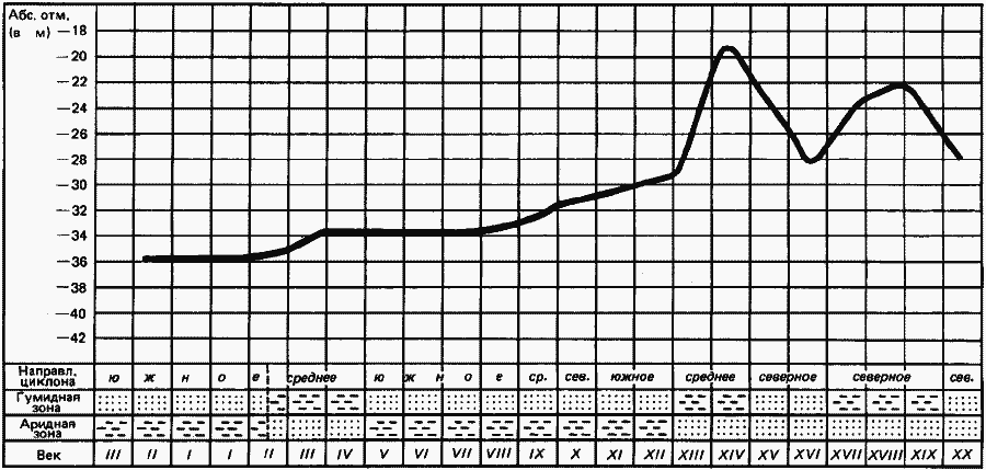 Любопытно, что период расцвета кочевой культуры совпадает с периодом низкого стояния Каспия на отметке минус 32 м. Когда же в X в. произошло очередное (около 3 м) поднятие уровня Каспийского моря, связанное, согласно нашей концепции, с кратковременным перемещением увлажнения в гумидную зону, то мы снова видим выселение кочевых племен из современной территории Казахстана на юг и на запад. Карлуки в середине X в. из Прибалхашья переселяются в Фергану, Кашгар и современный южный Таджикистан [160]. Печенеги покидают берега Аральского моря еще в конце IX в. и уходят в южное Поднепровье; за ними следуют торки или гузы, распространяющиеся между Волгой и Уралом [11, с.336–353]. Это выселение не очень большого масштаба, но оно показательно своим совпадением с изменением уровня Каспия, что подтверждает правильность принятой нами гипотезы. Нет оснований связывать эти передвижения с крупными политическими событиями, потому что в то же самое время на территории Восточной Монголии, лежащей за пределами действия атлантических циклонов, история уйгуров имела совсем иной оборот.