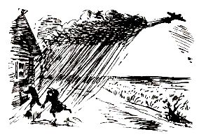Люди, стоявшие внизу, закрывшись рукавами, бросились к избам; светло-каштановая земля мгновенно стала мокрой и черной.