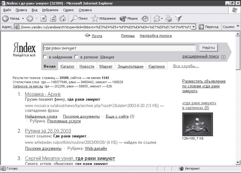 Если вы не хотите углубляться в детали техники поиска, то можете просто задать поисковой машине вопрос так же, как задали бы его человеку, у которого хотите получить совет. Например, «как быстро похудеть», «есть ли жизнь на Марсе», «где раки зимуют» (рис. 4.2) или просто «работа журналиста».