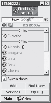 Важнейшей элементом ICQ, является Contact List (Список контактов) – список друзей, с которыми у вас налажен контакт в этой сети. Список контактов состоит из двух групп: Online (Подключены) и Offline (Отключены). В группе Online располагаются пользователи, находящиеся в данный момент в Интернете, а в группе Offline, соответственно, те, кого в Сети нет. Пользователь, подключившийся или отключившийся от ICQ, сразу же перескакивает из одной группы в другую. Помимо имен, в списке контактов отображается также статус каждого из друзей. По нему можно определить, готов ли пользователь к общению с вами или нет.