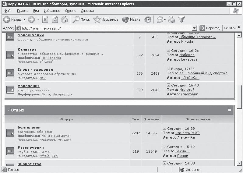Форум представляет собой раздел сайта, предназначенный для общения посетителей: обсуждения содержимого сайта, затрагиваемой на сайте тематики или же просто беседы о чем угодно. Часто форумы делятся на категории (Компьютеры, Знакомства, Бизнес и т. п.), в каждой из которых ведутся разговоры на темы, соответствующие названиям категорий (рис. 5.9).
