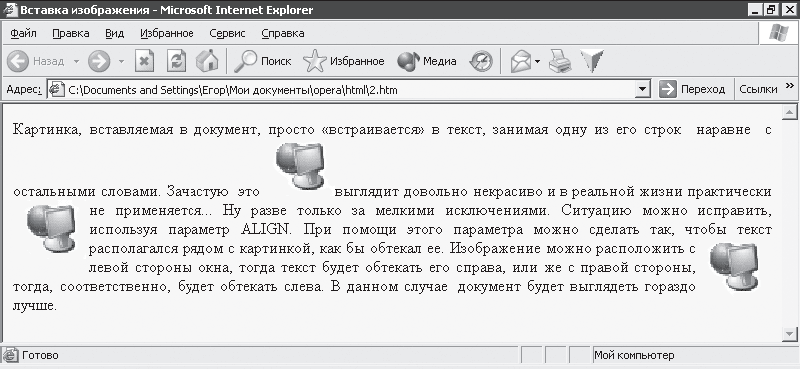 Картинка, вставляемая в документ описанным выше способом, просто «встраивается» в текст, занимая одну из его строк наравне с остальными словами. Зачастую это выглядит довольно некрасиво. Ситуацию можно исправить, используя параметр ALIGN тега <IMG>.