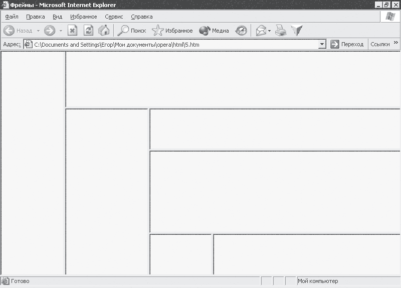 Кстати говоря, совершенно не обязательно делить страницу только на строки или столбцы. Можно превосходно сочетать оба эти способа. Давайте, например, разобьем страницу на два горизонтальных фрейма, а нижний, в свою очередь, – на два вертикальных: