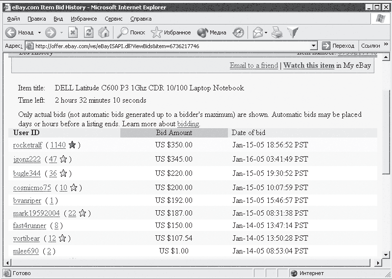 Рис. 7.6. Борьба за ноутбук Dell на интернет-аукционе eBay