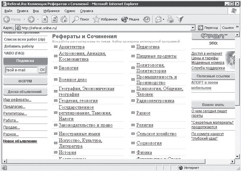 Кстати, море информации – это еще не все, что может дать Интернет! Вы не забыли о форумах? В Сети существуют форумы, посвященные практически всем направлениям человеческой жизнедеятельности, где специалисты той или иной области обмениваются между собой опытом, учат новичков и дают полезные советы.