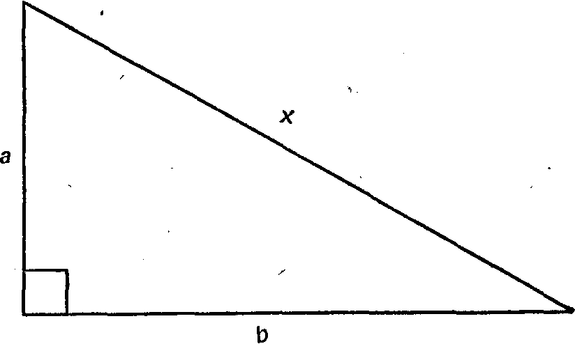 Простым примером сказанного может служить знаменитая геометрическая теорема древнегреческого геометра Пифагора, которая знакома любому школьнику. Эта теорема относится к прямоугольным треугольникам; на рис. 25 длины сторон такого треугольника обозначены соответственно а, b, х. Теорема Пифагора утверждает, что эти величины связаны между собой простой формулой х^2 = а^2+b^2. Если положить для удобства а = 3, b = 4, то х = 5, поскольку 52 = З2 + 42.