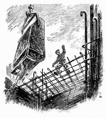 А сверху уже маячит в синем небе бадья, летит стремительно, сыплет щебень и льет раствор.