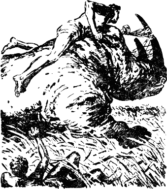На поляне под двумя деревьями стояла очень большая хижина с навесом перед входом. Здесь собрались вожди для осмотра прибывших. Вокруг теснились почти все жители деревни, взволнованные необыкновенным происшествием. По просьбе главного вождя негр со сломанной ногой повторил рассказ о страшной охоте на носорога, часто показывая на спокойно лежавшего Пандиона.
