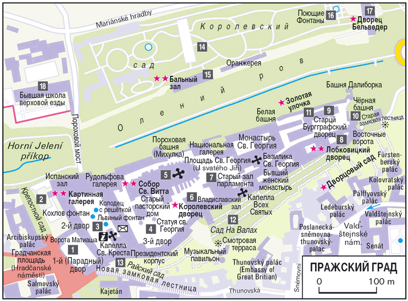 Идеальным местом для начала обстоятельного знакомства с Градом, которое без посещения музеев требует как минимум полдня, будет Первый двор Града (1). Туда можно попасть с Градчанской площади (Hradcansk'e n'amest'i). Проект Парадного двора,как ещё называют Первый двор Града, принадлежит венскому придворному архитектору Никколо Пакасси.