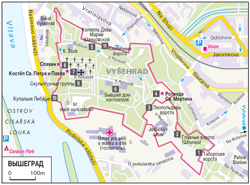 От станции метро Vysehradвы проходите мимо современного Дворца культуры, вдоль старого укрепления, к Таборским воротам (T'aborsk'a br'ana) (1) в стиле раннего барокко, которые, как передовой пост, стоят перед сдавшей свои позиции в 1866 году крепостью. Миновав эти ворота, с правой стороны вы увидите остатки позднеготических ворот «Шпичка» (Spicka) (2)и возведённой по приказанию Карла IV стены.