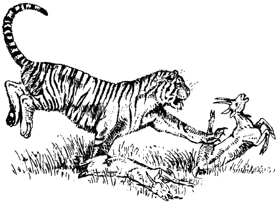 Когда Ибби уходил, он намеревался устроить засаду возле бычка, убитого четыре дня назад у деревни Тхак, — грифы его почему-то не тронули. Ибби считал, что, если тигр видел, как я лез на фикус, он не подойдет к этой добыче, а вернется к старой, и он его там застрелит. Услышав выстрелы, Ибби поспешил ко мне, полагая, что я нуждаюсь в помощи. Мы встретились в полумиле от фикуса и вместе пошли осмотреть тигра. Это был большой красивый самец в расцвете сил, не менее девяти футов шести дюймов в длину. Нижний правый клык у него действительно был сломан; позже я обнаружил несколько дробинок в разных частях его тела.