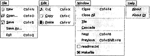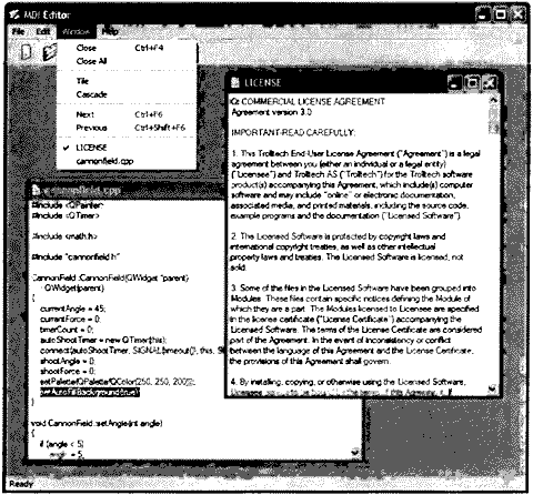 В конструкторе MainWindow мы создаем виджет QWorkspace и делаем его центральным виджетом. Мы связываем сигнал windowActivated класса QWorkspace со слотом, который мы будем использовать для обеспечения актуального состояния меню Window.