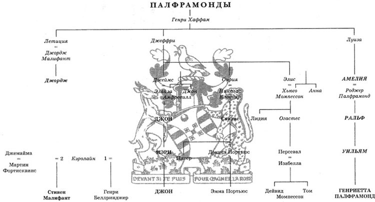 Персонажи, непосредственно не участвующие в событиях романа, обозначены курсивом. Те, кто мог бы владеть имением, если бы вступил в силу утаенный кодицилл Джеффри Хаффама, обозначены жирным шрифтом. Те, кто мог бы владеть имением, если бы было представлено в суд завещание обозначены КРУПНЫМ ЖИРНЫМ шрифтом.