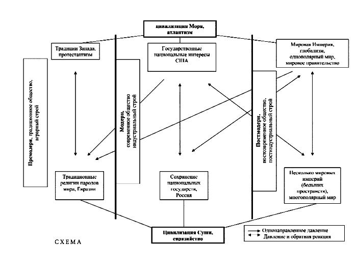 Как мы видим на схеме, глобализация сталкивается с двумя типами сопротивления – по линии модерна этому противятся (отчасти по инерции) суверенные государства, а на глобальном уровне однополярному миру противостоит многополярный мир, или проект «созвездия новых империй», «больших пространств», что представляет собой ответ в плоскости постмодерна. И наконец, последняя линия напряжения проходит между проектом многополярного мира (евразийским постмодерном) и национальными интересами США как государства.