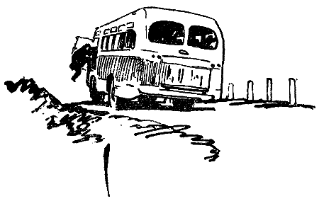Мара влезает в кабину и изо всех сил жмет на тормозную педаль. Силы не хватает. Мара отчаянно крутит рулевое колесо, стараясь вывести автобус на дорогу. Наконец автобус останавливается.