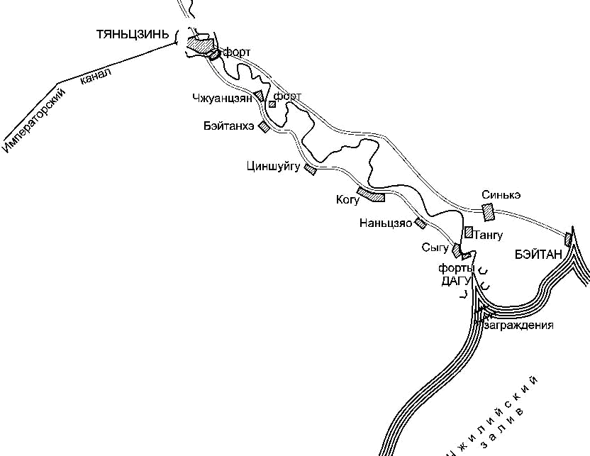 Баржи и катера поддерживали сообщение между расположенными на внешнем рейде эскадрами и расположенной на Пэйхо в нескольких километрах выше устья городок Тонка - китайское адмиралтейство с корабельными мастерскими. Откуда же начиналась железная дорога на лежащий в 50 км дальше столицу провинции Чжили - Тяньцзинь. Дорога была уже очищена от ихэтуаней союзниками и морской пехотой Тинга, по восстановленным рельсам курсировали импровизированные бронепоезда, вооруженные пулеметами и легкими орудиями.