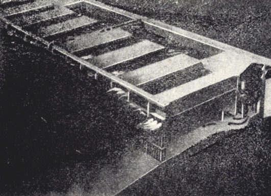 Сооружение представляет собой прямоугольный ящик, установленный на дне, на глубине 15-20 м, примерно в 5-10 км от берега. Оно имеет размеры гигантского танкера. Одна половина его разделена бетонными стенками на шеренгу камер, плотно закрытых затворами с резиновым уплотнением. Затворы открываются лишь внутрь, и напрашивающимся сравнением является шеренга уличных почтовых ящиков, положенных отверстиями вверх. При движении волны вода через отверстия под давлением попадает во внутреннюю полость, представляющую резервуар, в котором можно поддерживать повышенный уровень воды. Поднятие свободной поверхности при прохождении гребня волны создает избыточное давление по сравнению с гидростатическим давлением на обратной стороне затвора, и это давление открывает заслонки, ведущие во внутреннюю полость.