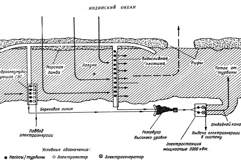 Проект, как сказал мне м-р Рассел, обладает «достоинством исключительной простоты». Это может быть одной из причин того, что проект привлек меньше внимания сравнительно с некоторыми другими. Кроме того, по-видимому, это один из приемлемых проектов для районов с невысоким уровнем прилива, как, скажем, остров Маврикий или Средиземноморье. Он обладает существенным преимуществом перед первоначальным планом Ботта, и это преимущество состоит в том, что при прохождении подошвы волны вода высасывается из нижнего резервуара наружу; эффективность схемы Ботта определялась потенциальной энергией только поднятой воды.