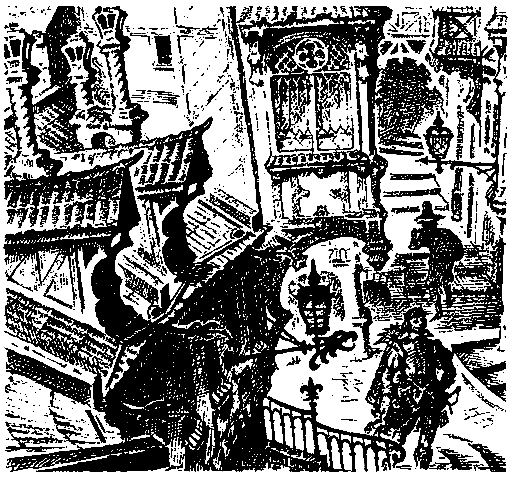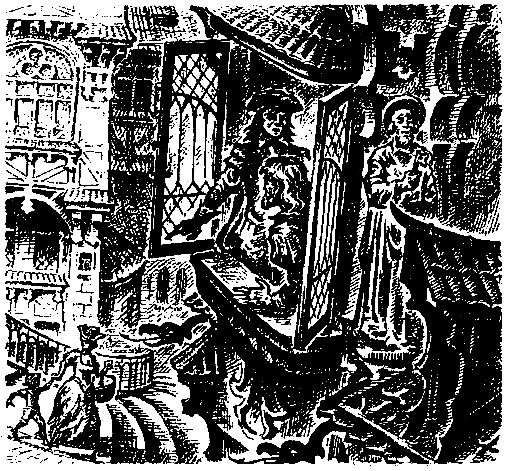 Солнце, яркое для осени, озаряло волосы О'Лайам-Роу, который стоял у окна приемной и глядел вниз на улицу. Там двигались головы, непокрытые и под капюшонами, вот колыхнулось красное перо на мужской шляпе, сверкнул шелк, затем мелькнули белая кисея и синий бархат высокого женского убора, а следом — плащ слуги. Проехала тележка, нагруженная бочонками с пивом; служанка с промокшим подолом прошла от фонтана с ведром в руке. Наконец какой-то мужчина остановился у дома напротив и прислонился к дверному косяку, поглаживая черную бороду.
