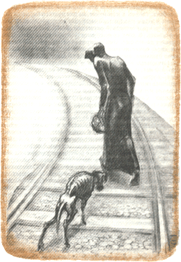 Ноги обернуты в тряпье, в руках ставший словно свинцовым узелок, голова, повязанная черным платком побежденной воительницы, опущена — кажется, будто Ана Пауча идет против ветра, — глаза сухи, в них отражаются лишь шпалы да заляпанный мазутом щебень.