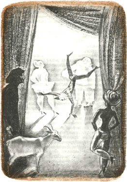 Эгерия с ртом-раной, с опутанными блестками жирными телесами, на высоченных каблуках, что придает ей вид чудовищного паука, с выступающими вперед, словно у вампира, зубами, хриплым и таинственным голосом перечисляет неслыханные сюрпризы, ожидающие дорогую публику: двойная жизнь природы, о которой мы даже не подозреваем, потрясающее знание тайн вселенной благодаря посредничеству тела-экрана феномена. Она изливает длинный список чудес, извиваясь в чувственном ритме румбы, — переодетый женщиной Люцифер, который пренебрегает режимом, но не утратил своей опустошительной энергии. Под куполом сгущается жара, смешиваясь с удушающим запахом людского пота и пылью Дети захвачены постыдными, недетскими мыслями, виноватый румянец окрашивает их щеки, губы пересыхают. Но вот появляются клоуны, они кувыркаются и гримасничают. Однако тщетно, им не удается отвлечь внимание публики от прелестей красавицы, выкупленной у сарацинов, как объявляет своим хорошо поставленным голосом господин директор.