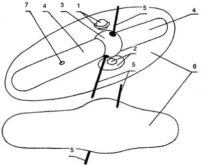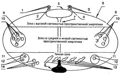 3, 4 — находящиеся возле полюсовой структуры Метавселенной (поз.5) централизованные мобильные эфирные структуры Дэваэволюции, создающей эфирные (в основном базовые) структуры репликационной энергетики, формирующие живых существ Метавселенной.