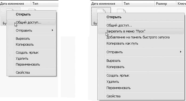 Рис. 4.17. Контекстное меню для файла при отпущенной (слева) и нажатой (справа) клавише Shift