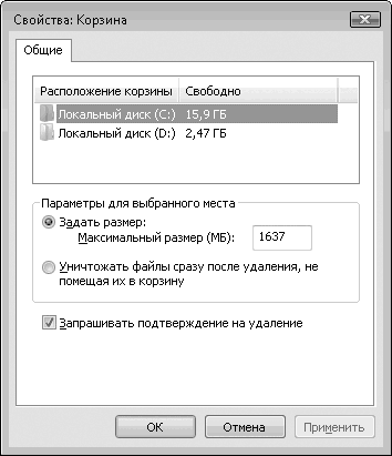 С помощью настройки свойств Корзины можно задать поведение системы при удалении файлов. Чтобы это сделать, щелкните правой кнопкой мыши на значке Корзины на Рабочем столе и выберите пункт Свойства. В появившемся окне (рис. 4.25) можно задать максимальный размер Корзины на каждом разделе жесткого диска. Для этого выделите нужный раздел в списке и введите требуемое значение в поле Максимальный размер (МБ). Если объем файлов в Корзине превысит указанное вами значение, то наиболее давние объекты будут автоматически удалены. Кроме того, система не сможет поместить в Корзину файл, превышающий ее размер, и предупредит об этом.