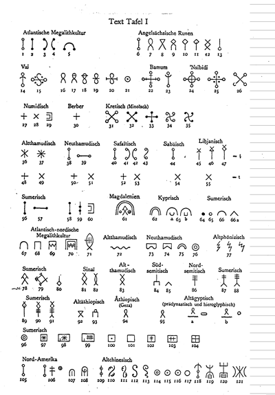 Вирт приводит тысячи примеров этих фонем и идеограмм от пещерных рисунков палеолита до близких к нам религиозных символов и даже художественных орнаментов, развившихся, кстати, из культовых фигур.