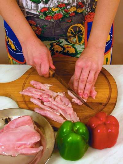 Филе курицы вымыть, обсушить и нарезать тонкими длинными кусочками.