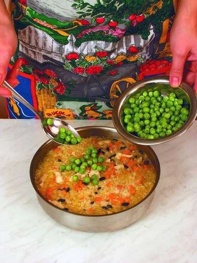 К готовящемуся плову добавить предварительно размороженный зеленый горошек.