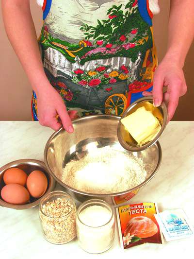3,5 стакана муки, 0,5 стакана овсяных хлопьев, 150 г маргарина, 1 стакан сахара, 1 ч. ложка питьевой соды или разрыхлителя теста, 3 яйца, 1 лимон, 1 пакетик ванилина, 100 г очищенных грецких орехов, 100 г черники, соль по вкусу.
