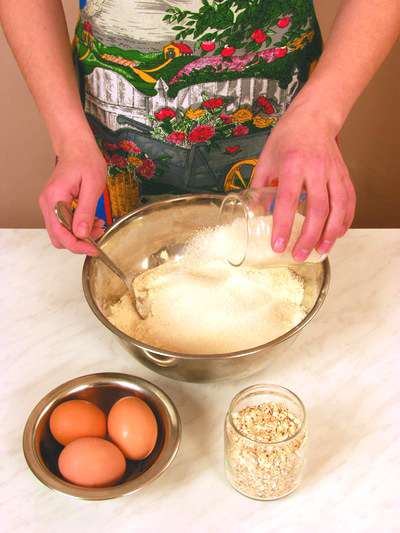 Просеянную муку высыпать в глубокую емкость, удобную для смешивания.