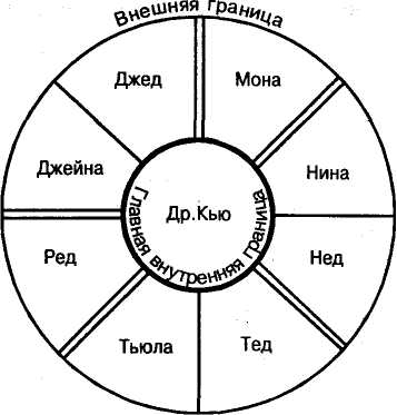 Особый аспект структурной диаграммы приобретает значение в семейной или брачной терапии, где в действительности существуют меньшие границы в районе членства (рисунок 4). В брачный группах каждая супружеская пара в ситуациях стресса функционирует как особая отдельная единица, так что терапевту приходится иметь дело не с восемью индивидуальными пациентами, а с четырьмя подгруппами. Аналогично в семейных группах родители могут функционировать как подгруппа, действующая «единым фронтом против детей», которые в свою очередь образуют подгруппу. Терапевт в подобных ситуациях должен отчетливо представлять себе, когда пациенты действуют как индивиды, — ив этом случае он имеет дело с простой группой, а когда они разделяются на конфликтующие или вступающие в союз подгруппы, — и в этом случае он имеет дело со сложной или составной группой.