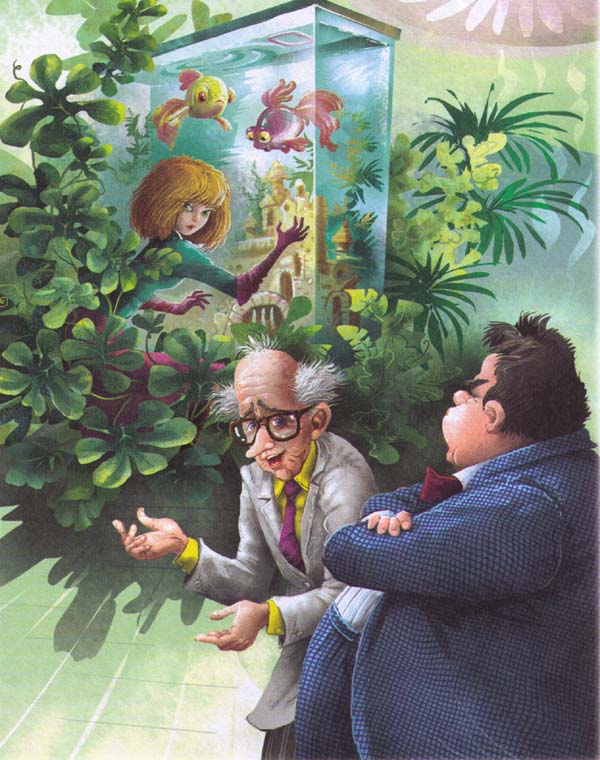 А Мурли не ушла домой. Никто не заметил, как она проскользнула в соседний зал — размером поменьше. Похоже, это был зал заседаний. Посреди стоял длинный стол со стульями, в углу — ящик с растениями, а рядом с ним — аквариум с золотыми рыбками.