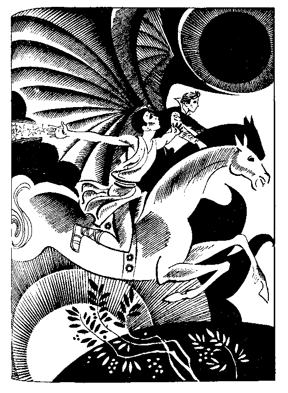 За стволом дерева мелькнула фигура Рудри. Он накинул на крылатого коня седло. Тот вздрогнул словно от ожога. С ветки сорвалась дождевая капля и розовым яблоком укатилась в траву.