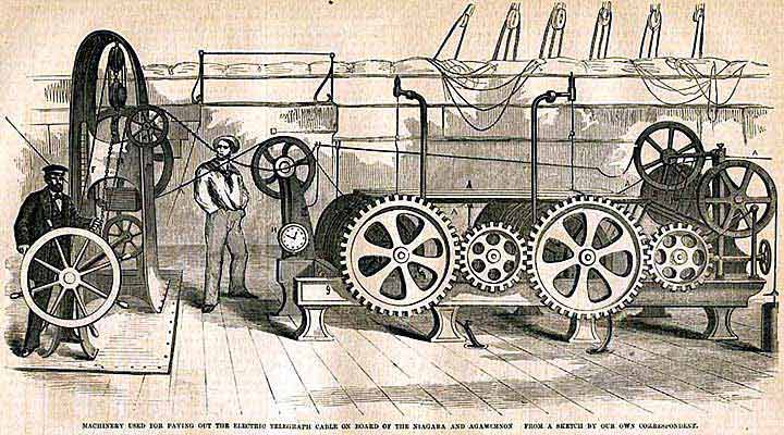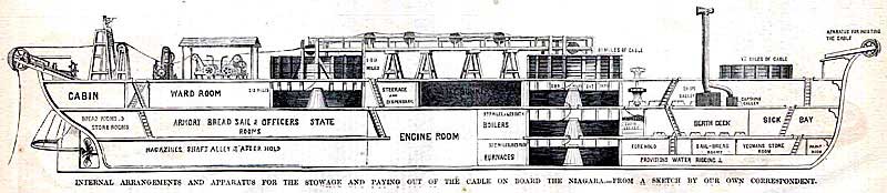 "...С «Ниагарой» поддерживается постоянная телеграфная связь по кабелю, который она тянет в Америку. Вытравливание кабеля за борт происходит со скоростью, несколько большей, чем скорость самого судна, с учётом неровностей морского дна. В понедельник «Ниагара» и её спутники удалились от Англии на расстояние свыше 370 километров. Они вышли далеко за пределы мелководья. Лаг мистера Брайта показывал увеличение глубины от 1000 до 3200 метров, причём это изменение произошло на отрезке пути всего лишь в 15 километров. Затем корабли вошли в район ужасающей глубины - до 3600 метров. Однако железная струна благополучно погружается в пучину, о чём свидетельствуют вспышки света в затемнённой аппаратной от сигналов, посылаемых по кабелю с берега".
