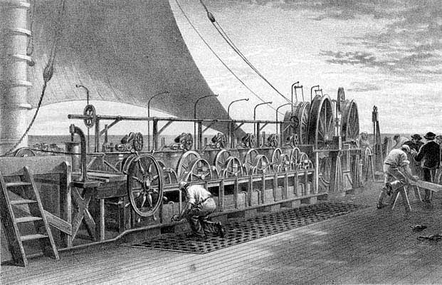 Кабель в процессе прокладки выматывается из одного из трюмов - баков "Грейт Истерна"
