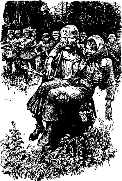 …Когда дядя Клим подполз к жене, она была без сознания. Он осторожно взял ее на руки и понес. Эсэсовцы продолжали упорно преследовать отчаянного партизана. Они решили, что он в их руках, и, поднявшись во весь рост, шли к нему цепью. Дядя Клим понял, что окружен. «Нет, гады, не таков дядя Клим, чтобы в руки вам сдаться!»