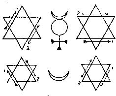 Для призывания или изгнания планет или зодиакальных знаков используется только Гексаграмма Земли. Чертите гексаграмму, начиная с точки, соответствующей планете, с которой вы работаете (см. «777», столбец lxxxiii). Например, для призывания Юпитера нужно начать с правого угла основания нижнего треугольника и, двигаясь по часовой стрелке, закончить его, затем начать верхний треугольник с левого угла его основания и закончить.