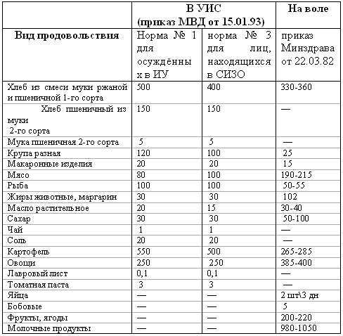 Как видим, даже подследственный в СИЗО, у которого, по сравнению с осуждённым, урезана норма на хлеб, крупу, растительное масло и картошку, и тот имеет пайку на уровне научно обоснованной энергетической ценности.