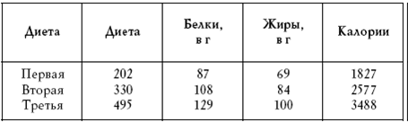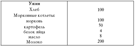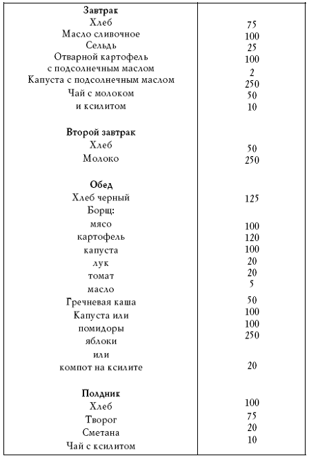 Состав диеты: 200–250 г мяса или рыбы, 200–300 г творога, 50 мл молока, 5 – 10 г масла, 50 г хлеба, 100 г картофеля, до 1000 г овощей и до 300 г несладких фруктов в день.