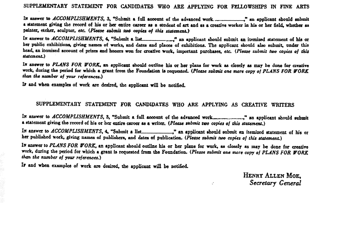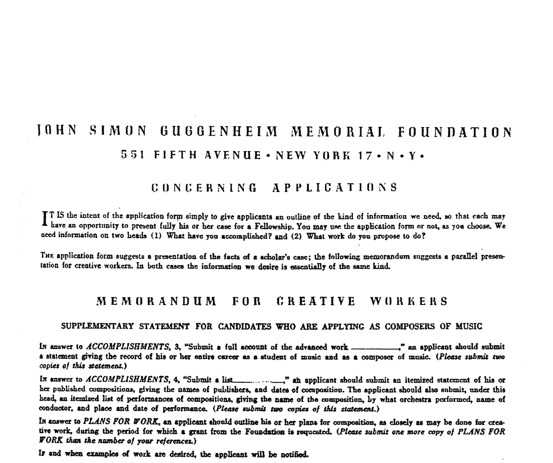 Бланк заявки в фонд Гуггенхайма подана 13 октября 1949 года