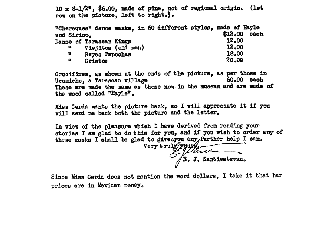 Искреннее Ваш, E. Дж. СантиэстеванПоскольку синьорина Серда не упоминает слово «доллары», то я полагаю, ее цены указаны в мексиканской валюте.