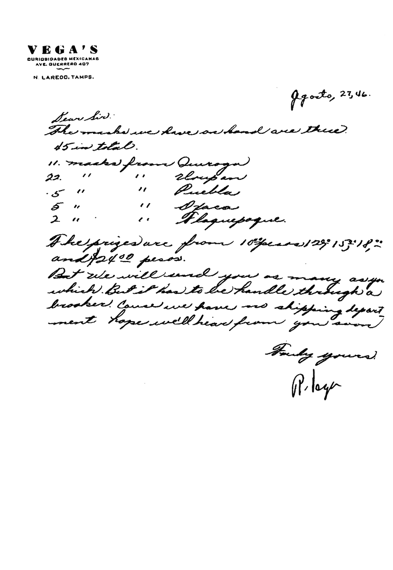 Наконец-то мне удалось получить весточку от синьорины Серды насчет масок, и я рад приложить к настоящему письму высланную ею фотографию. Также прилагаю ее письмо, и на случай, если Вы не владеете испанским, ниже приводится его изложение: