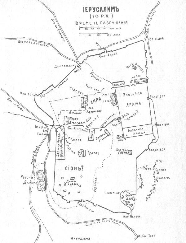 Иерусалим вместе с прилегающими к нему постройками исчислялся периметром в тридцать три стадии. [604] Город имел множество ворот, например с севера — Ефремовы ( {Эп-р'a-йим}), Старые ( {hай-ша-н'a}) и Рыбные ( {hад-да-гим}) (Неем.3:3; 12:39); с востока — Конские ( {hас-су-сим}) и Водяные ( {hам-м'a-йим}) (Неем.3:26,28); с юга — ворота Источника ( {hа-'a-йин}) (Неем.2:14; 3:15; 12:37); а с запада — ворота Долины ( {hаг-г'aй}) (Неем.2:13; 3:13). Через Сузские (Конские) ворота можно было сразу войти на площадь Храма, весь периметр которой заключал в совокупности четыре стадии, причем каждая сторона ее имела одну стадию в длину (Jos.AJ.XV.11:3). С северной стороны площади Храма была построена прямоугольная крепость, славившаяся своей неприступностью. Ее возводили еще предшественники Ирода Великого из рода Хашмонаев и назвали ее Барисом. Здесь до 4 г до н. э. хранилось священное облачение, которое надевал только первосвященник в случае необходимости принести жертву. Ирод I еще более укрепил эту цитадель и назвал ее Антонией в честь бывшего римского полководца Антония. Говорят, вместе с тем был сооружен для царя подземный ход, ведший из башни Антония до самого Храма, вплоть до восточного входа. Тут Ирод воздвиг для себя еще одну башню, куда он мог проникнуть подземным ходом, ежели бы пришлось опасаться народных смут (Ibid.11:4,7).