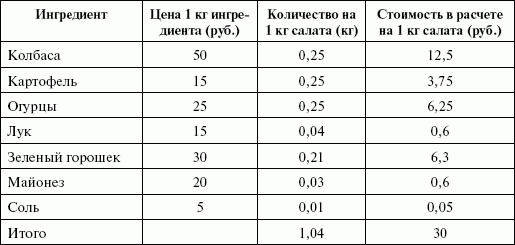 Для простоты мы рассмотрим ситуацию с одним условным салатом, который назовем «Оливье». Для его производства требуется колбаса, картофель, огурцы, лук, зеленый горошек, майонез и соль. По опыту, в течение дня при различных ценах за килограмм мы можем продать максимально 100 кг салата, минимально – 10 кг. В среднем по всем дням продаж в течение месяца с учетом сезонности – 50 кг. Для производства салата на один килограмм нам необходимо определенное количество продуктов, и затраты на их приобретение показаны в табл. 4.2. Это будут наши переменные затраты на единицу продукции (1 кг салата).